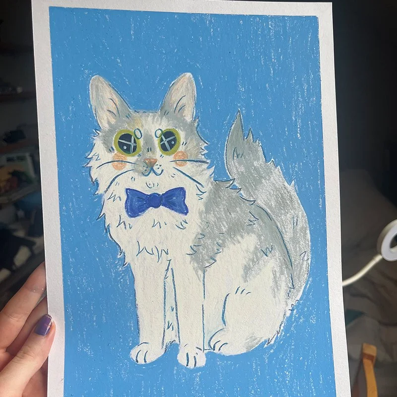 The pricing is tiered and will depend on the medium you’ve chosen, whether you’ve added any extras, and whether you want it printed and shipped. I will discuss the price with you, but for your reference, a digital portrait for one pet costs £20, and a wax pastel portrait for one pet costs £50. Both have a £5 printing and shipping fee.