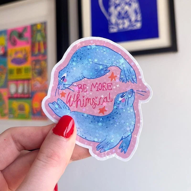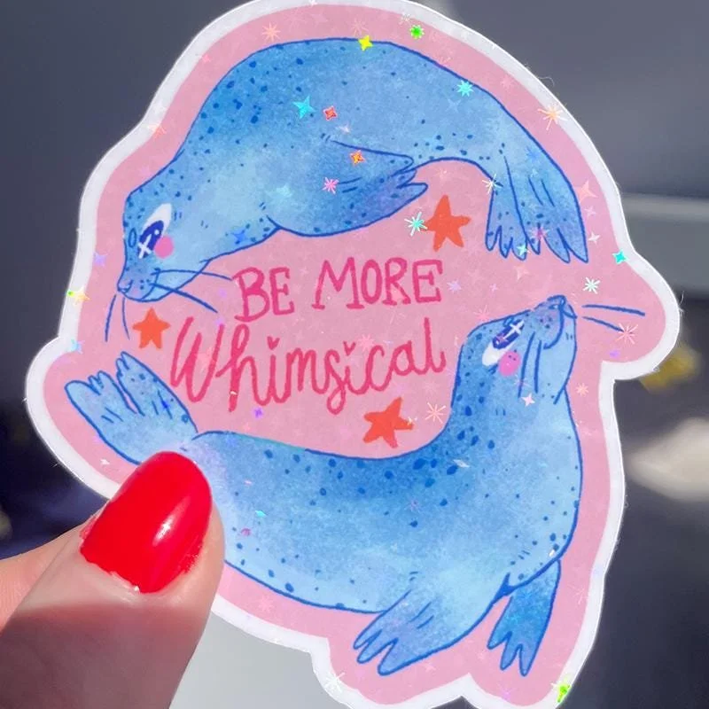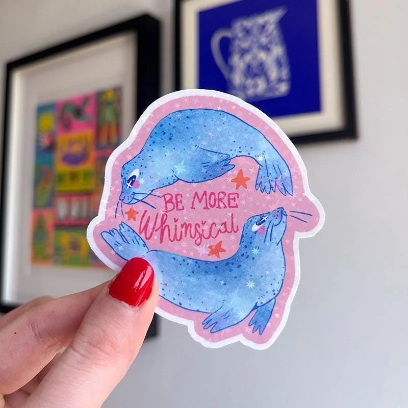 Sparkly waterproof sticker, perfect for water bottles, laptops and notebooks! Text reads be more whimsical with two seals swimming around it on a pink background with a sparkly holographic vinyl.